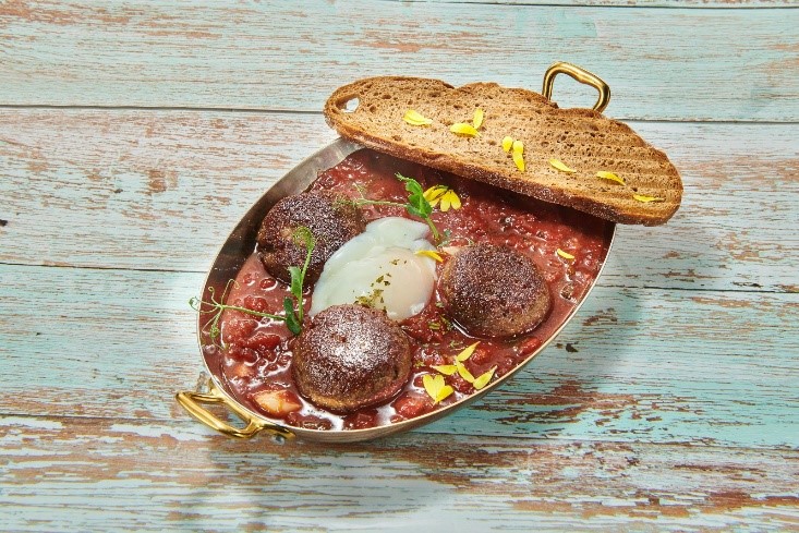 Beef Impossible, Egg, Tomato Coulis, Tomatoes, Sourdough